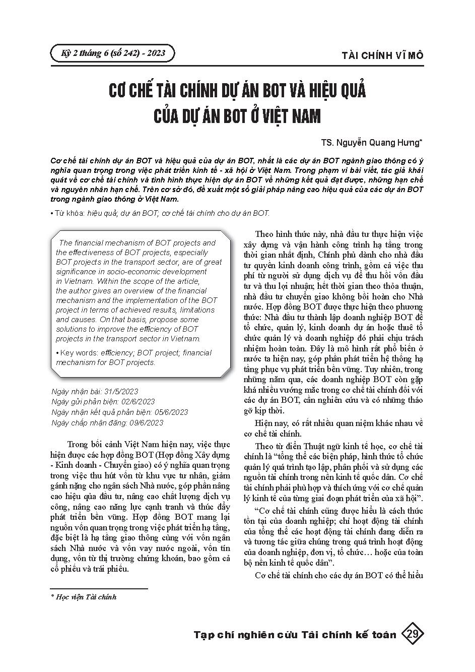 Cơ chế tài chính dự án bot và hiệu quả của dự án bot ở Việt Nam = Financial mechanism of BOT projects and the efficiency of BOT projects in Vietnam