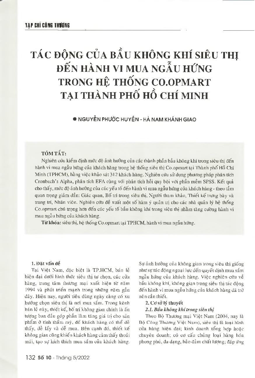 Tác động của bầu không khí siêu thị đến hành vi mua ngẫu hứng trong hệ thống Co.opmart tại Thành phố Hồ Chí Minh = The impacts of the supermarket atmosphere on the impulse buying behavior of customers at Co.opmart supermarket chain in Ho Chi Minh City