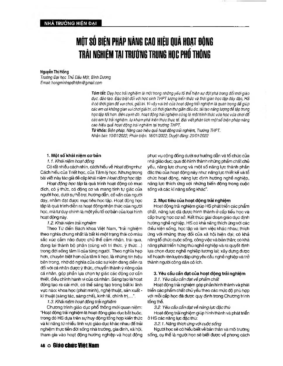 Một số biện pháp nâng cao hiệu quả hoạt động trải nghiệm tại trường trung học phổ thông = Some measures to improve the effectiveness of experiential activities at high schools