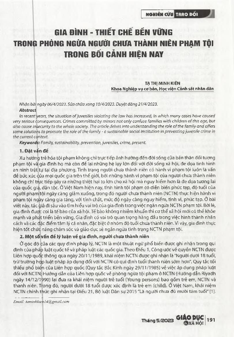 Gia đình - thiết chế bén vững trong phòng ngừa người chưa thành niên phạm tội trong bối cảnh hiện nay = The family - a sustainable institution for. juvenile crime prevention in the current context.