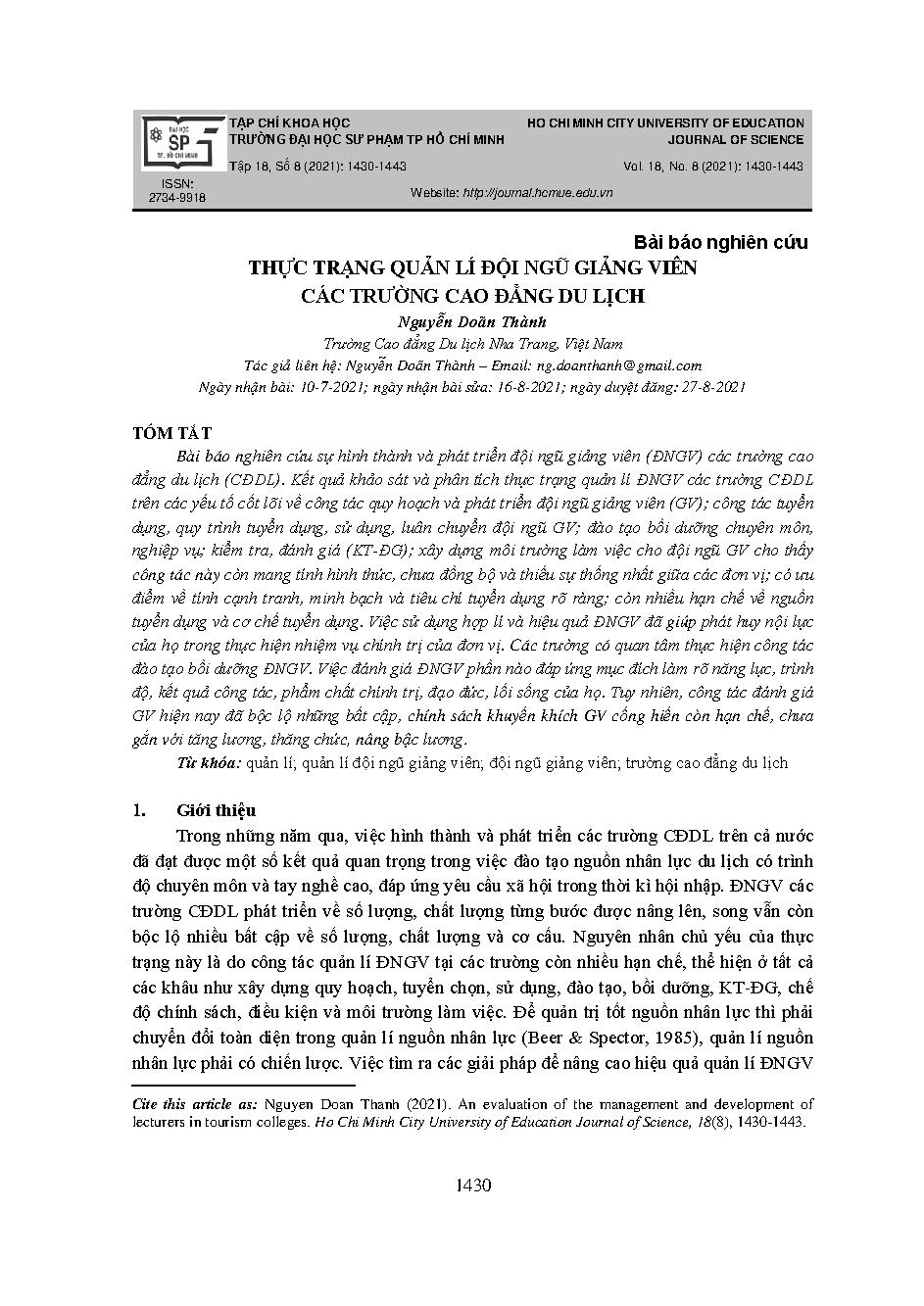 Thực trạng quản lí đội ngũ giảng viên các trường cao đẳng du lịch = An evaluation of the management and development of lecturers in tourism colleges