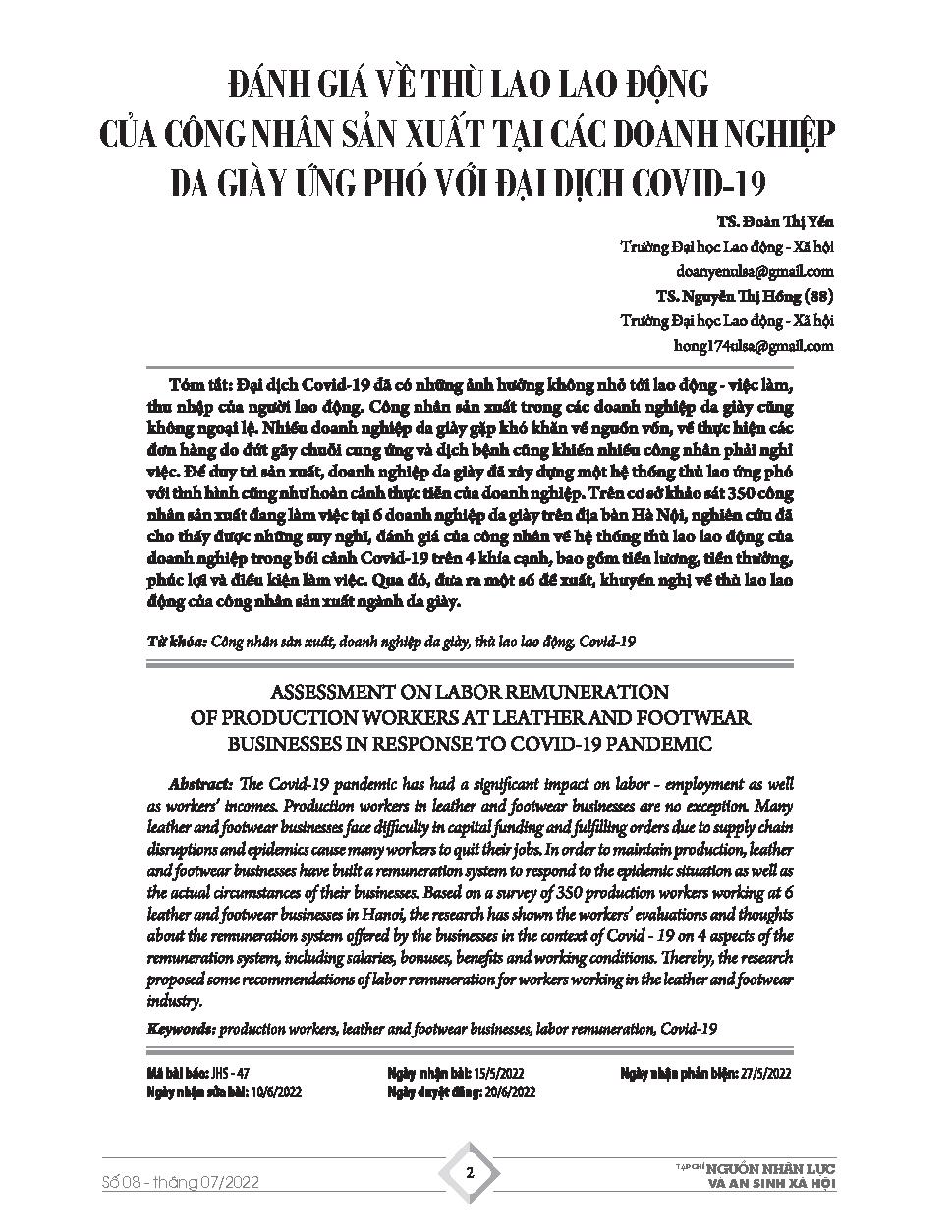Đánh giá về thù lao lao động của công nhân sản xuất tại các doanh nghiệp da giày ứng phó với đại dịch Covid-19 = Assessment on labor remuneration of production workers at leather and footwear businesses in response to Covid-19 pandemic