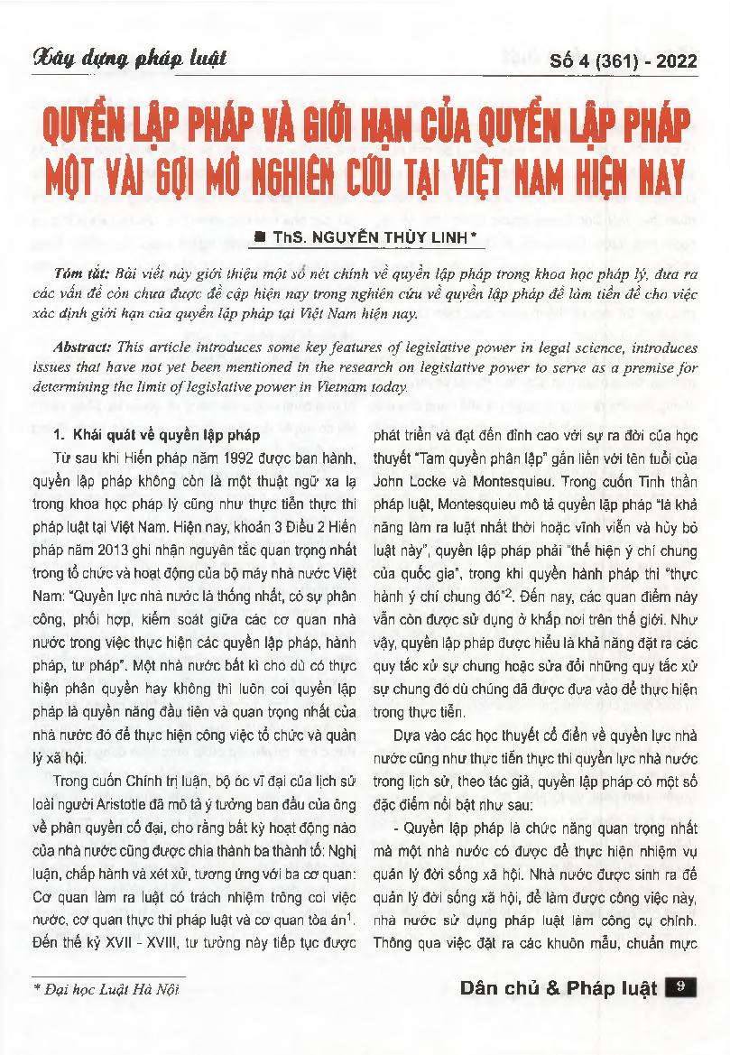 Quyền lập pháp và giới hạn của quyền lập pháp một vài gợi mở nghiên cứu tại Việt Nam hiện nay = H-Legislative power and limit of legislative power - Some suggestions for research in Vietnam today