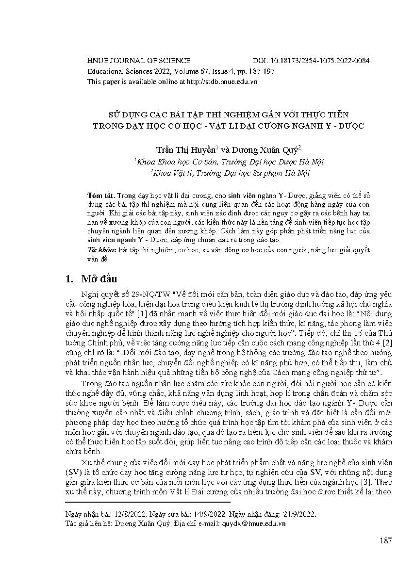 Sử dụng các bài tập thí nghiệm gắn với thực tiễn trong dạy học cơ học - vật lí đại cương ngành y - dược = Use experimental exercises related to authentic problems in teaching Mechanisms - General Physics of Medicine and Pharmaceutical