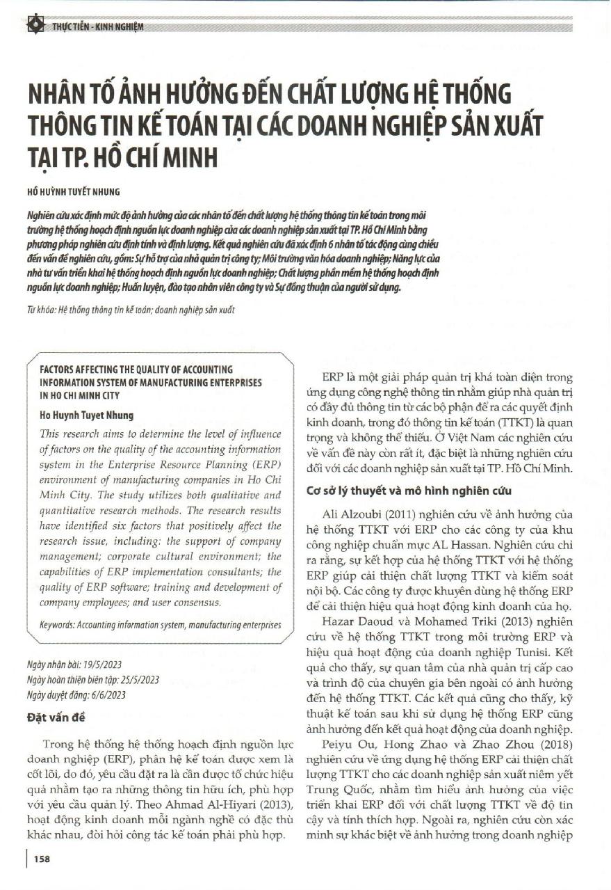 Nhân tố ảnh hưởng đến chất lượng hệ thống thông tin kế toán tại các doanh nghiệp sản xuất tại TP. Hồ Chí Minh