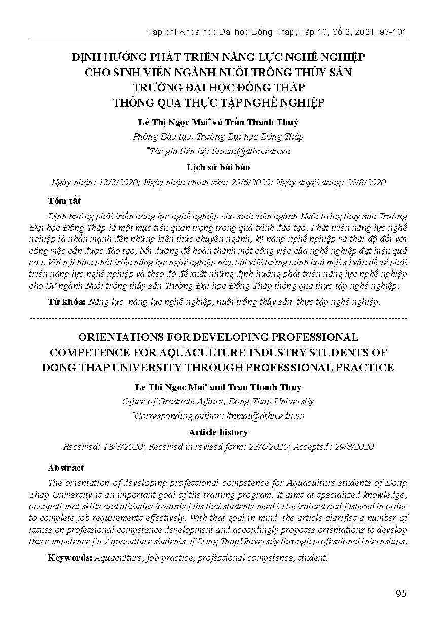 Định hướng phát triển năng lực nghề nghiệp cho sinh viên ngành Nuôi trồng thủy sản Trường Đại học Đồng Tháp thông qua thực tập nghề nghiệp = Orientations for developing professional competence for aquaculture industry students of Dong Thap university through professional practice