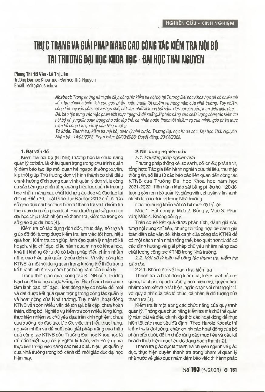 Thực trạng và giải pháp nâng cao công tác kiểm tra nội bộ tại Trường Đại học Khoa học, Đại học Thái Nguyên = The reality and solutions to improve the internal inspection at Thai Nguyen University of Sciences