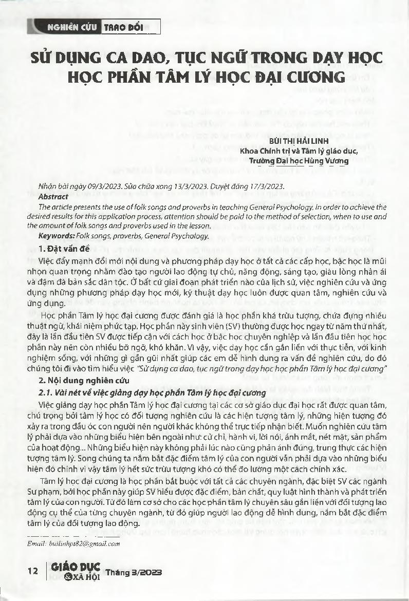 Sử dụng ca dao, tục ngữ trong dạy học học phần Tâm lý học đại cương = Using folk songs and proverbs in teaching General Psychology.