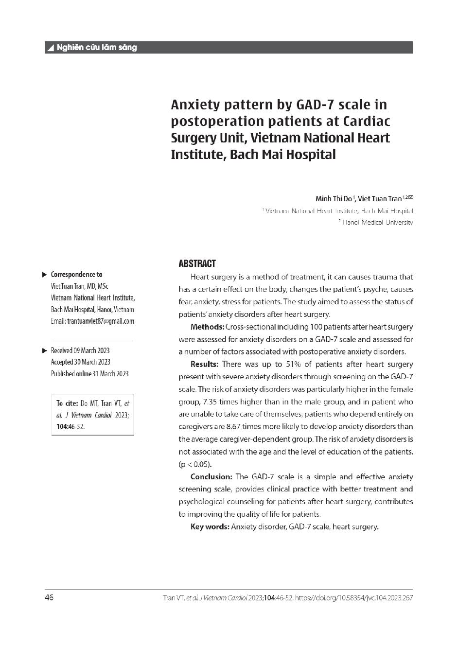 Đặc điểm lo âu trên thang GAD-7 ở bệnh nhân sau phẫu thuật tim mạch tại Đơn vị Phẫu thuật Tim mạch - Bệnh viện Bạch Mai = Anxiety pattern by GAD-7 scale in postoperation patients at Cardiac Surgery Unit, Vietnam National Heart Institute, Bach Mai Hospital