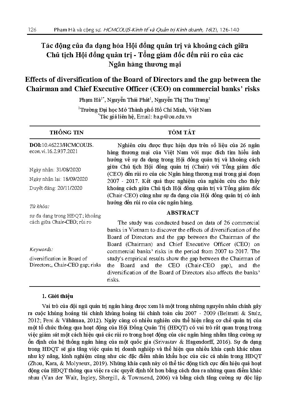 Tác động của đa dạng hóa Hội đồng quản trị và khoảng cách giữa Chủ tịch Hội đồng quản trị - Tổng giám đốc đến rủi ro của các Ngân hàng thương mại = Effects of diversification of the Board of Directors and the gap between the Chairman and Chief Executive Officer (CEO) on commercial banks’ risks