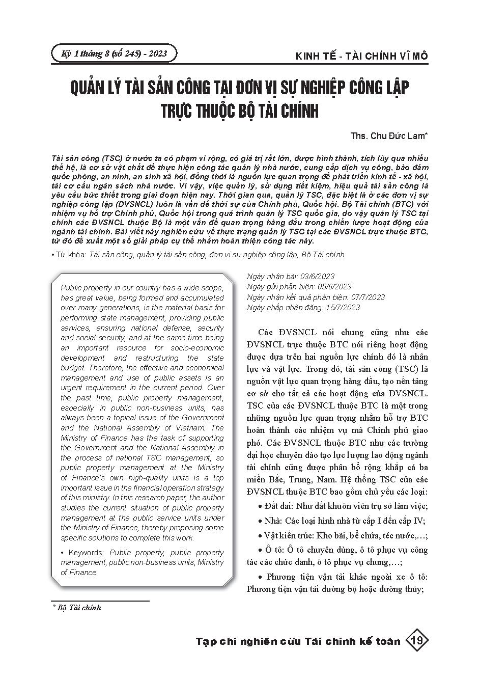 Quản lý tài sản công tại đơn vị sự nghiệp công lập trực thuộc Bộ Tài chính = Public asset management at the state-owned unit under the Ministry of Finance