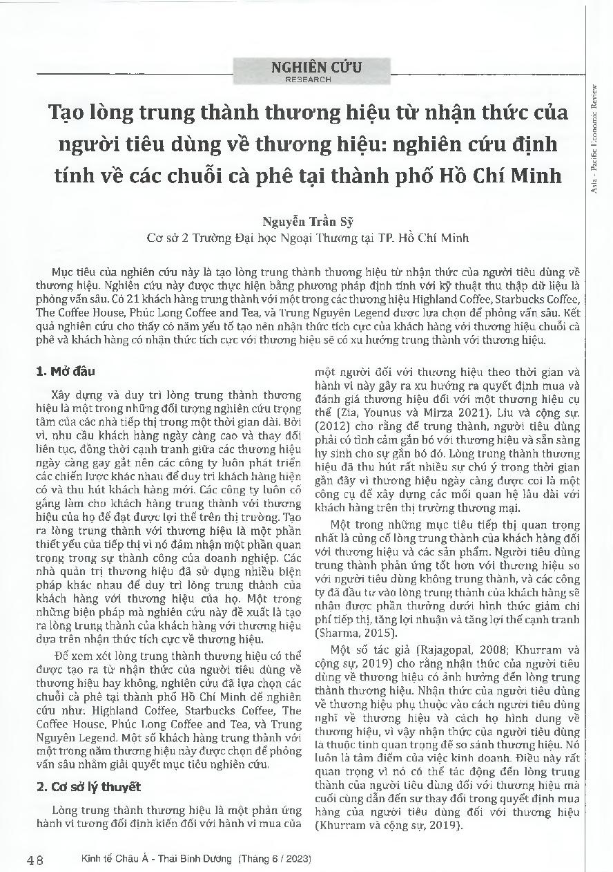 Tạo lòng trung thành thương hiệu từ nhận thức của người tiêu dùng về thương hiệu: nghiên cứu định tính về các chuỗi cà phê tại thành phố Hồ Chí Minh