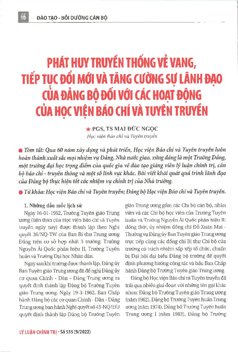Phát huy truyền thống vẻ vang, tiếp tục đổi mới và tăng cường sự lãnh đạo của Đảng bộ đối với các hoạt động của Học viện Báo chí và tuyên truyền = Uphold the glorious tradition, continue to innovate, and strengthen the leadership of the Party Committee ov