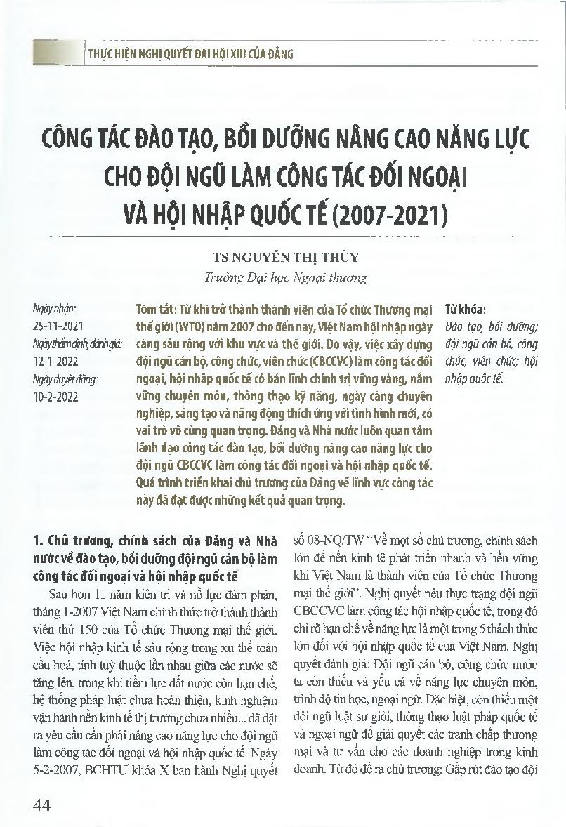 Công tác đào tạo, bồi dưỡng nâng cao năng lực cho đội ngũ làm công tác đối ngoại và hội nhập quốc tế (2007-2021)