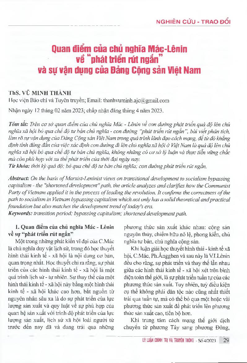 Quan điểm của chủ nghĩa Mác-Lênin về "phát triển rút ngắn" và sụ vận dụng của Đảng Cộng sản Việt Nam = Marxist-Leninist viewpoints on "shortened development" and application of the Communist Party of Vietnam