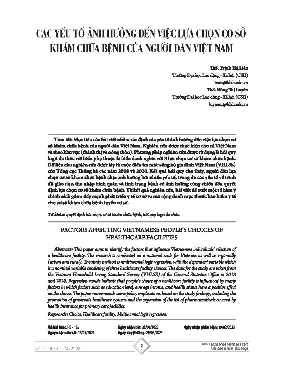 Các yếu tố ảnh hưởng đến việc lựa chọn cơ sở khám chữa bệnh của người dân Việt Nam = Factors affecting Vietnamese people's choices of healthcare facilities