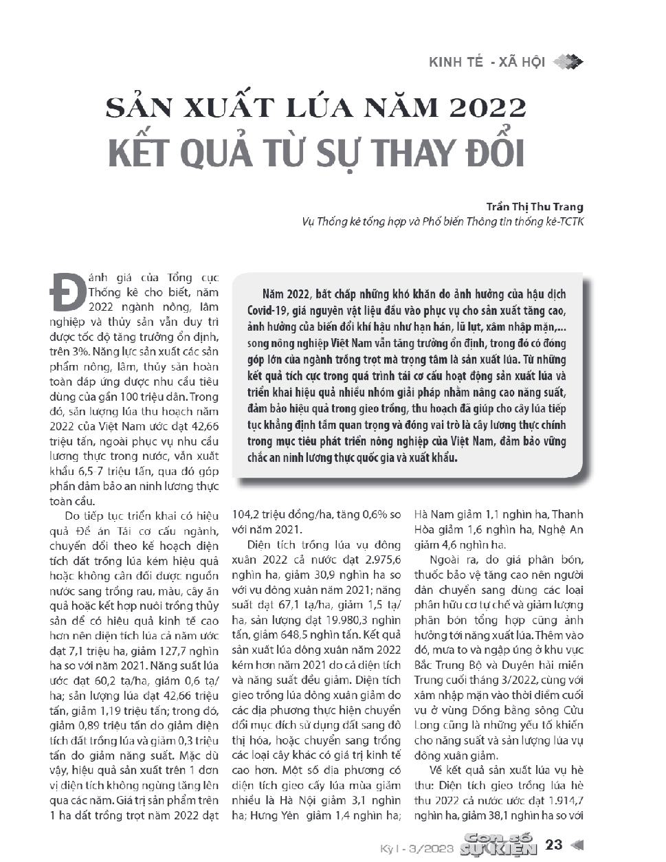 Sản xuất lúa năm 2022 - Kết quả từ sự thay đổi = Rice production in 2022 - Results from change