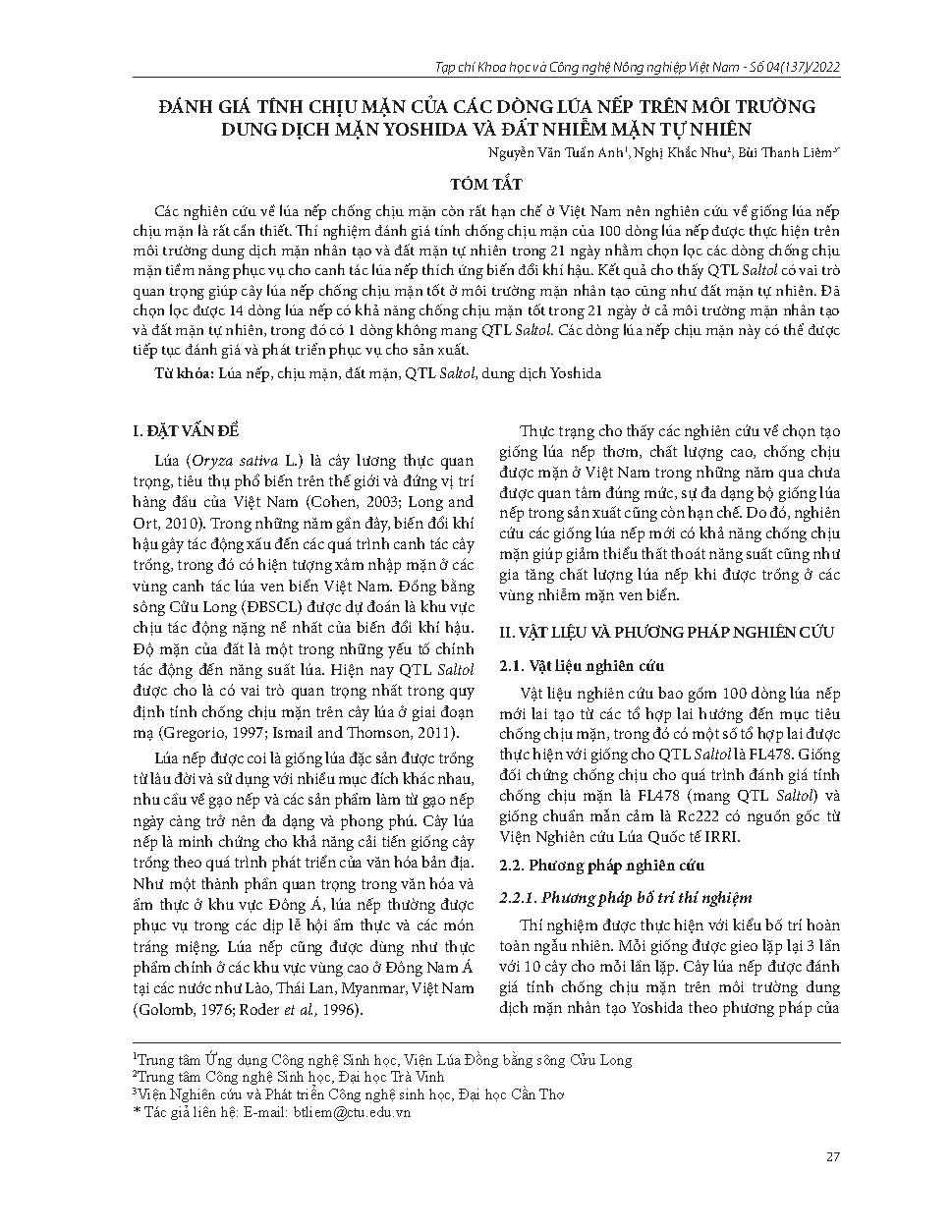 Đánh giá tính chịu mặn của các dòng lúa nếp trên môi trường dung dịch mặn Yoshida và đất nhiễm mặn tự nhiên = Evaluation of salt tolerance of glutinous rice lines in salted Yoshida solution and on natural saline soil
