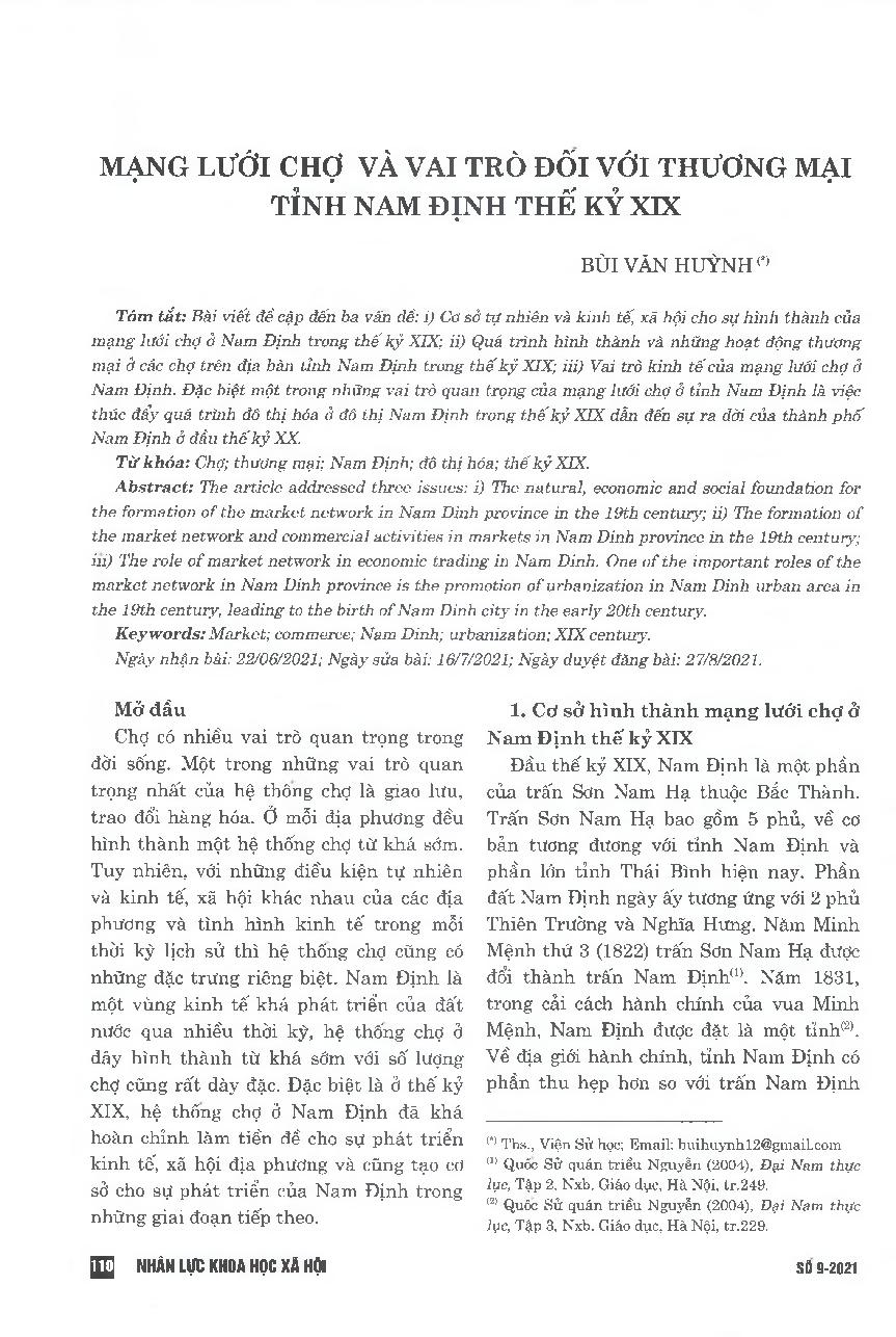 Mạng lưới chợ và vai trò đối với thương mại tỉnh Nam Định thế kỷ XIX = Market network and its role in trade in Nam Dinh province in the 19th century