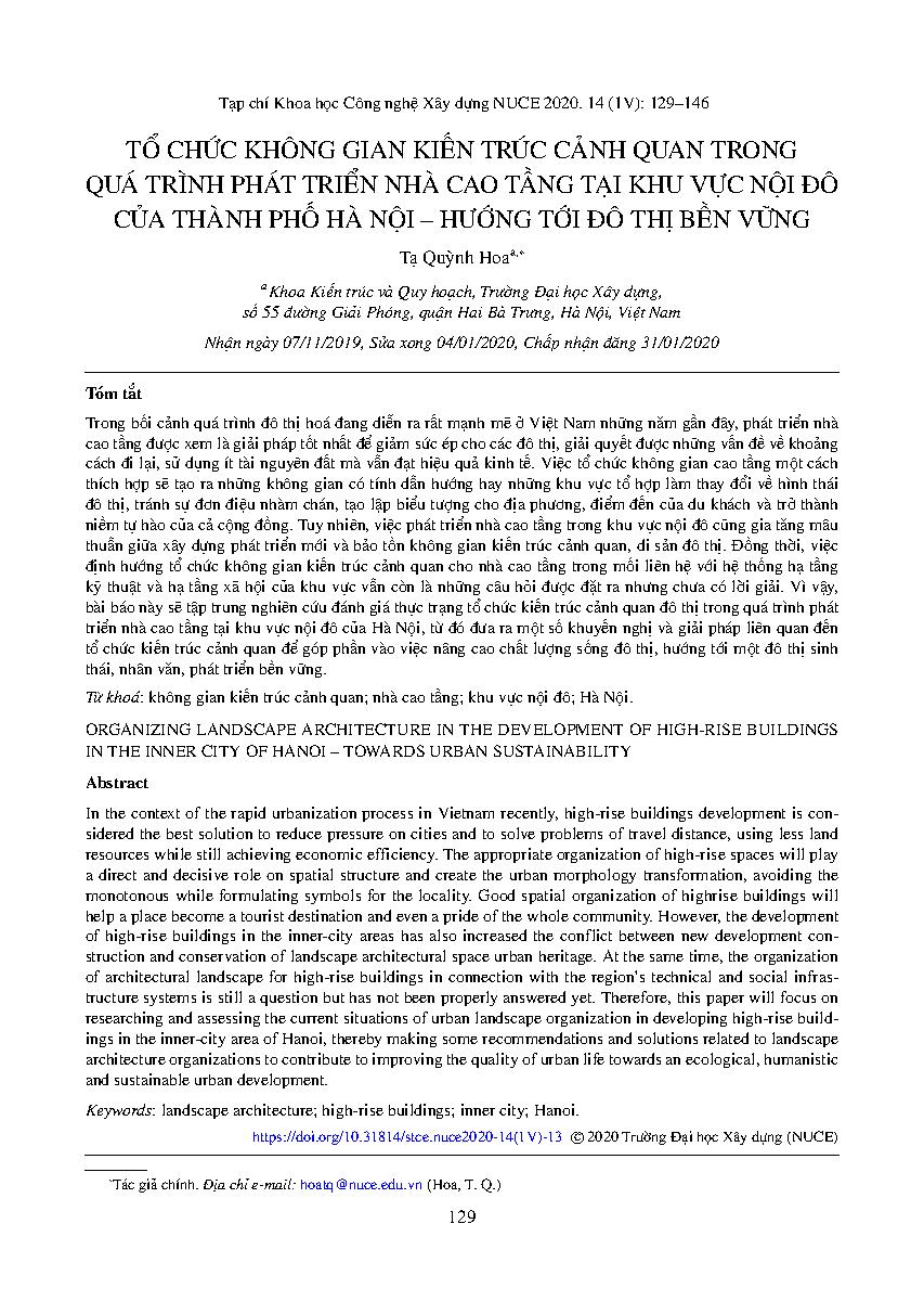 Tổ chức không gian kiến trúc cảnh quan trong quá trình phát triển nhà cao tầng tại khu vực nội đô của thành phố Hà Nội – hướng tới đô thị bền vững = Organizing landscape architecture in the development of high-rise buildings In the inner city of Ha Noi – towards urban sustainability