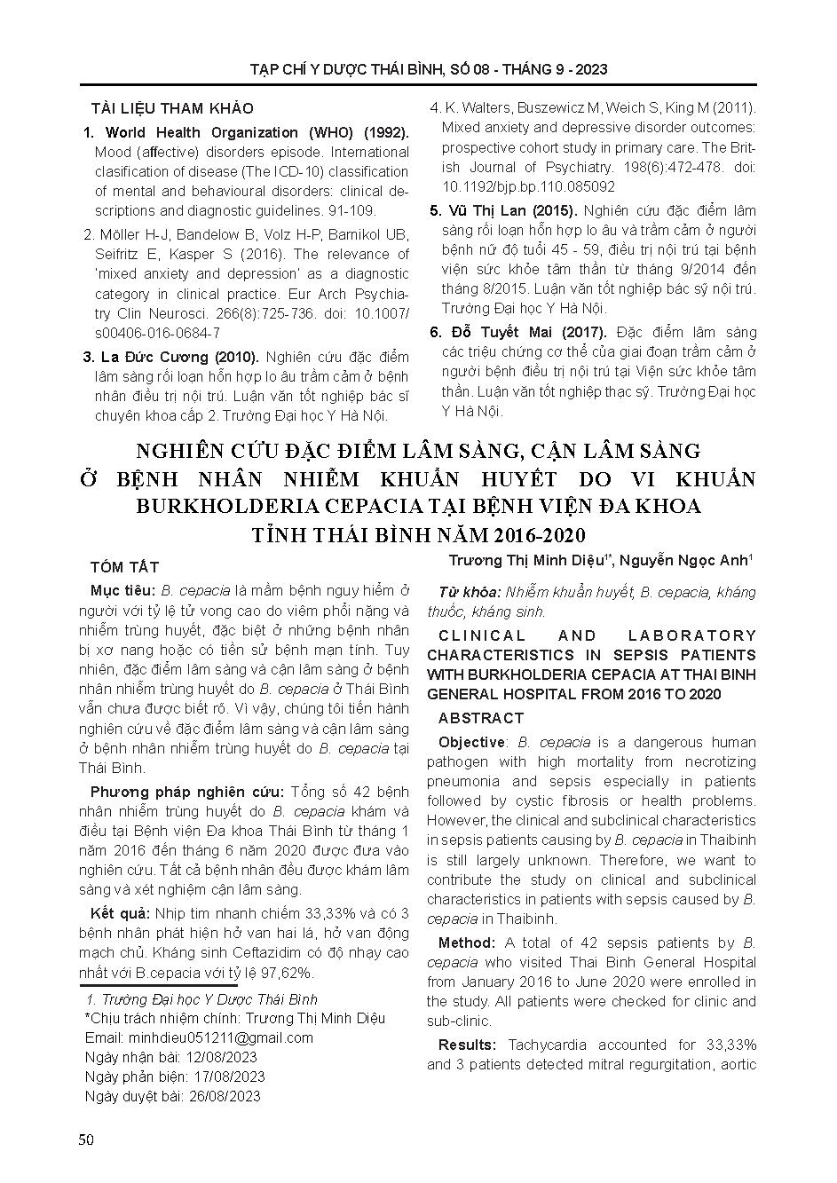 Nghiên cứu đặc điểm lâm sàng, cận lâm sàng ở bệnh nhân nhiễm khuẩn huyết do vi khuẩn Burkholderia Cepacia tại Bệnh viện Đa khoa tỉnh Thái Bình năm 2016-2020