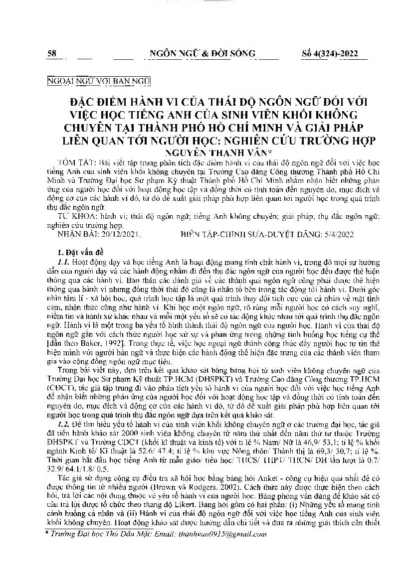 Đặc điểm hành vi của thái độ ngôn ngữ đối với việc học tiếng anh của sinh viên khối không chuyên tại thành phố Hồ Chí Minh và giải pháp liên quan tới người học: nghiên cứu trường hợp = Behavioral characteristics of language attitude towards learning Engli
