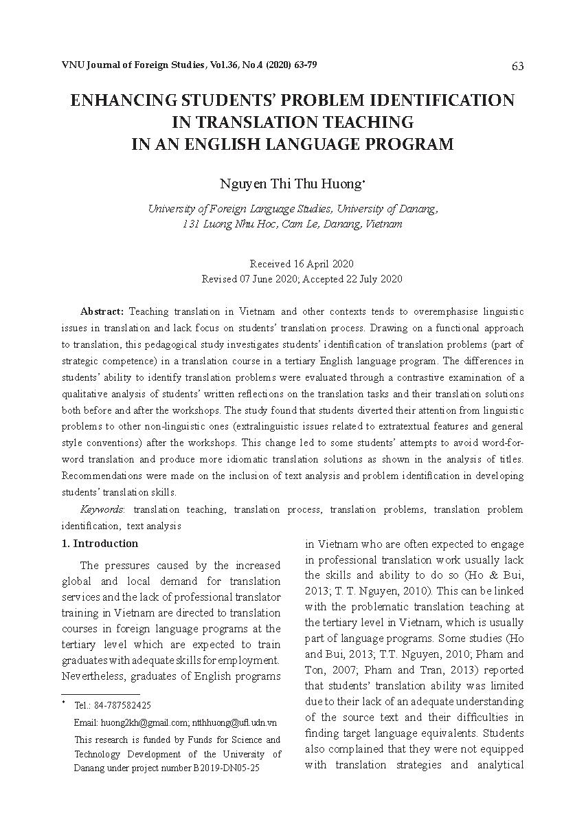 NÂNG CAO KHẢ NĂNG PHÁT HIỆN VẤN ĐỀ DỊCH THUẬT CỦA SINH VIÊN NGÀNH CỬ NHÂN ANH = ENHANCING STUDENTS’ PROBLEM IDENTIFICATION IN TRANSLATION TEACHING IN AN ENGLISH LANGUAGE PROGRAM