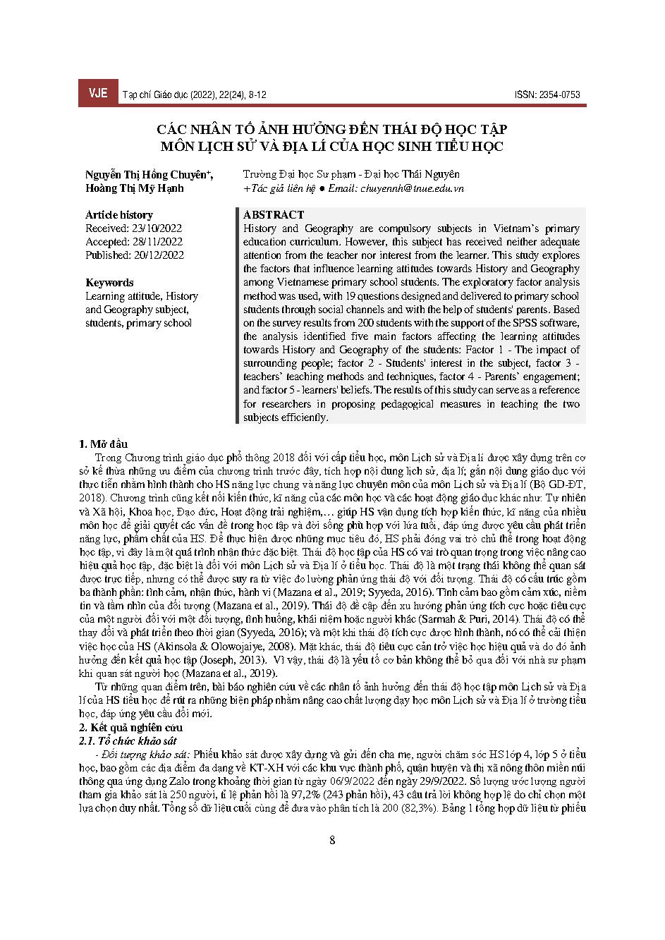 Các nhân tố ảnh hưởng đến thái độ học tập môn lịch sử và địa lí của học sinh tiểu học = Factors affecting the attitude of primary school students to study history and geography