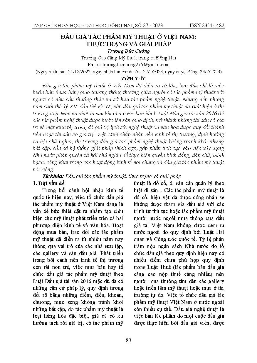 Đấu giá tác phẩm mỹ thuật ở Việt Nam: thực trạng và giải pháp = Art auctions in Vietnam: current state and solutions