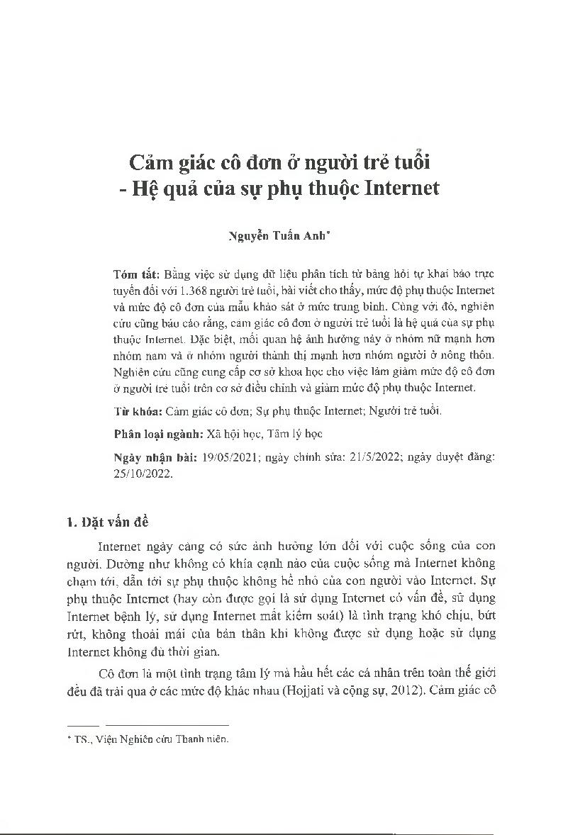 Cảm giác cô đơn ở người trẻ tuổi - Hệ quả của sự phụ thuộc Internet = Loneliness in Young People - Consequences of Internet Dependence