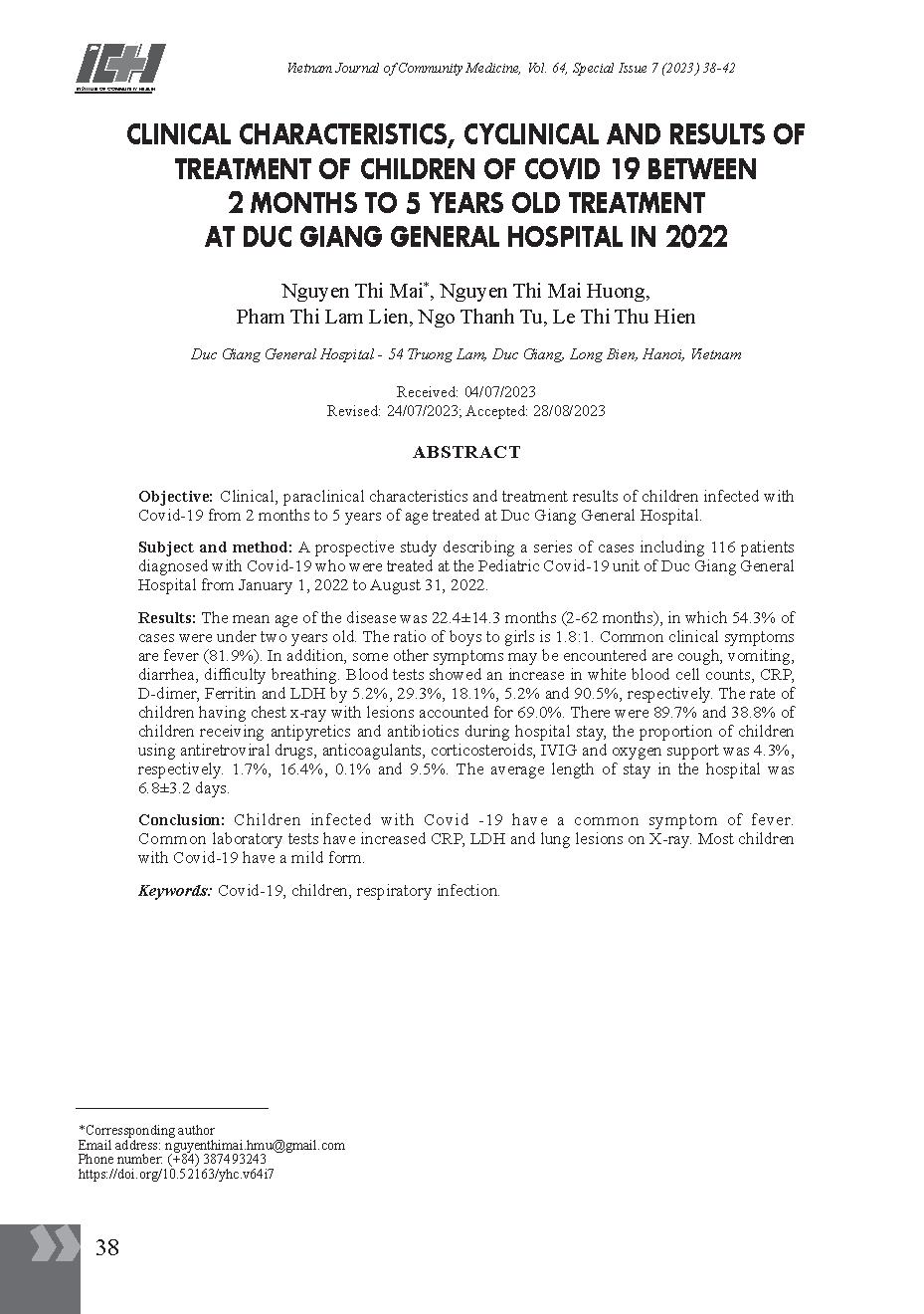 Đặc điểm lâm sàng, cận lâm sàng và kết quả điều trị trẻ nhiễm Covid-19 từ 2 tháng đến 5 tuổi điều trị tại Bệnh viện Đa khoa Đức Giang năm 2022 = Clinical characteristics, cyclinical and results of treatment of children of covid 19 between 2 months to 5 ye