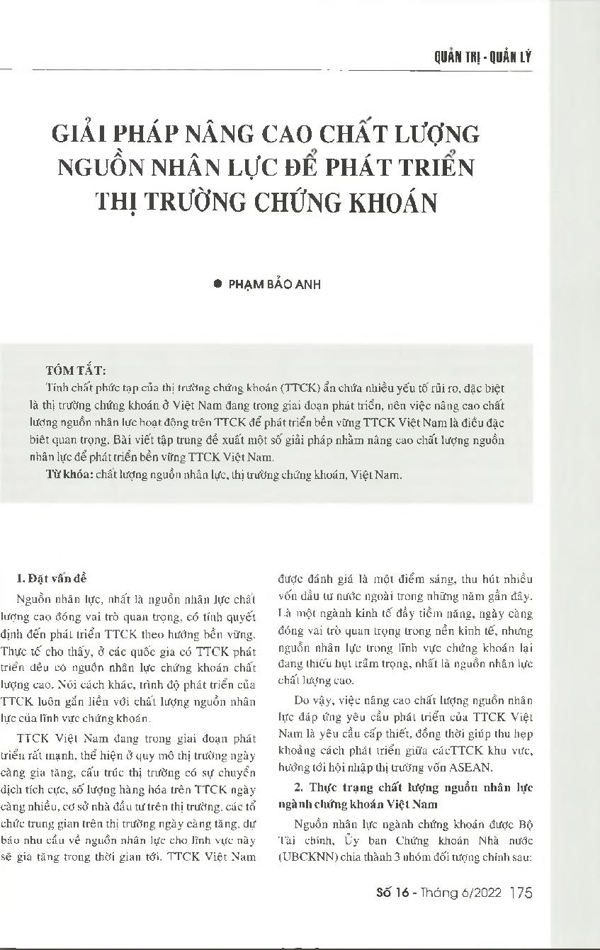 Giải pháp nâng cao chất lượng nguồn nhân lực để phát triển thị trường chứng khoán = Solutions to improve the quality of human resources for the sustainable growth of Vietnam&; 39;s stock market