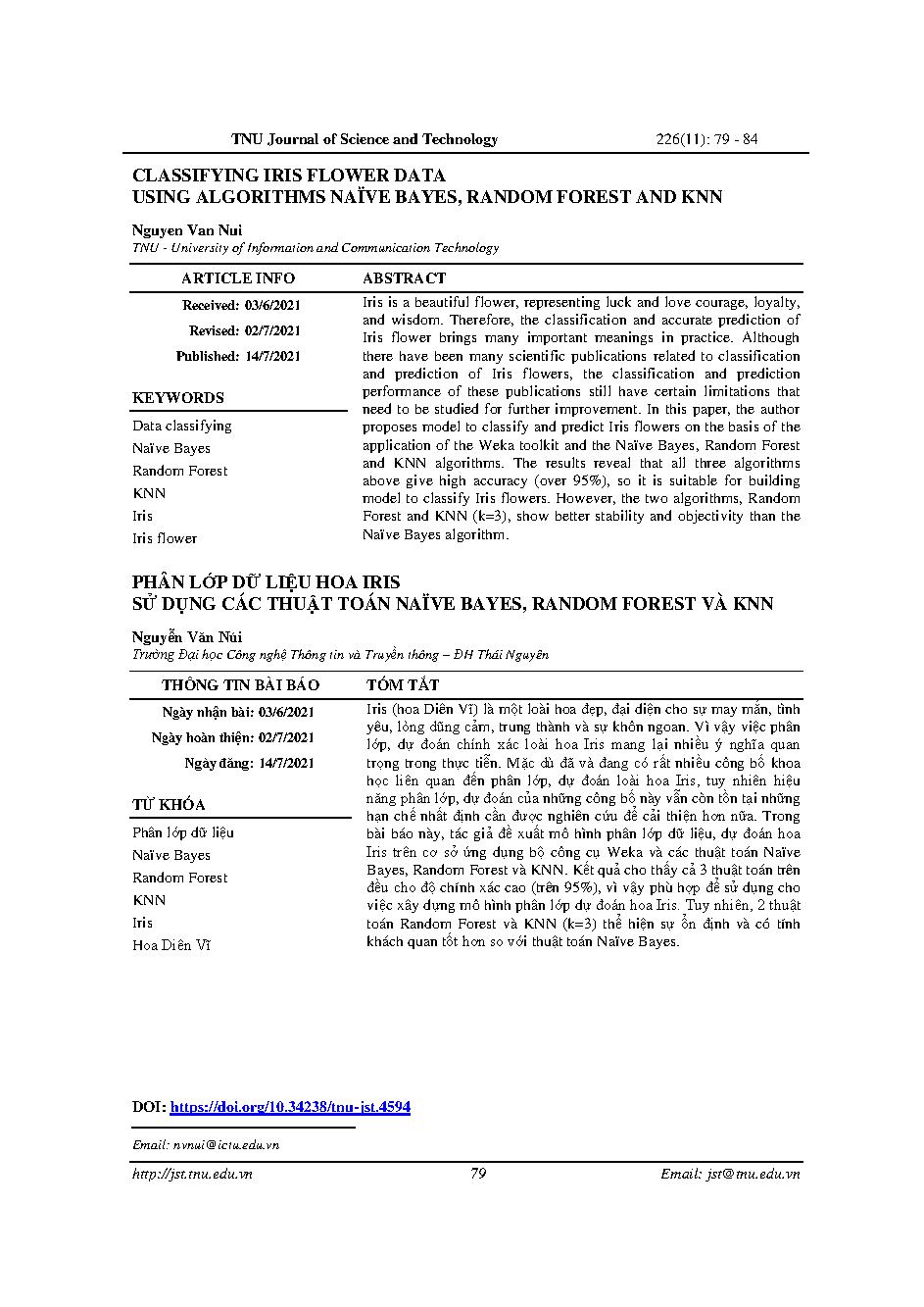 Phân lớp dữ liệu hoa iris sử dụng các thuật toán naïve bayes, random forest và KNN = Classifying iris flower data using algorithms naïve bayes, random forest and KNN