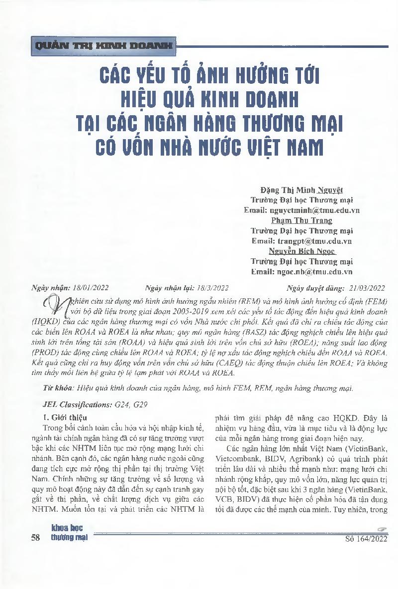 Các yếu tố ảnh hưởng tới hiệu quả kinh doanh tại các ngân hàng thương mại có vốn nhà nước Việt Nam = The Determinants of Bank Performance ofState-Owned Commercial Banks in Vietnam