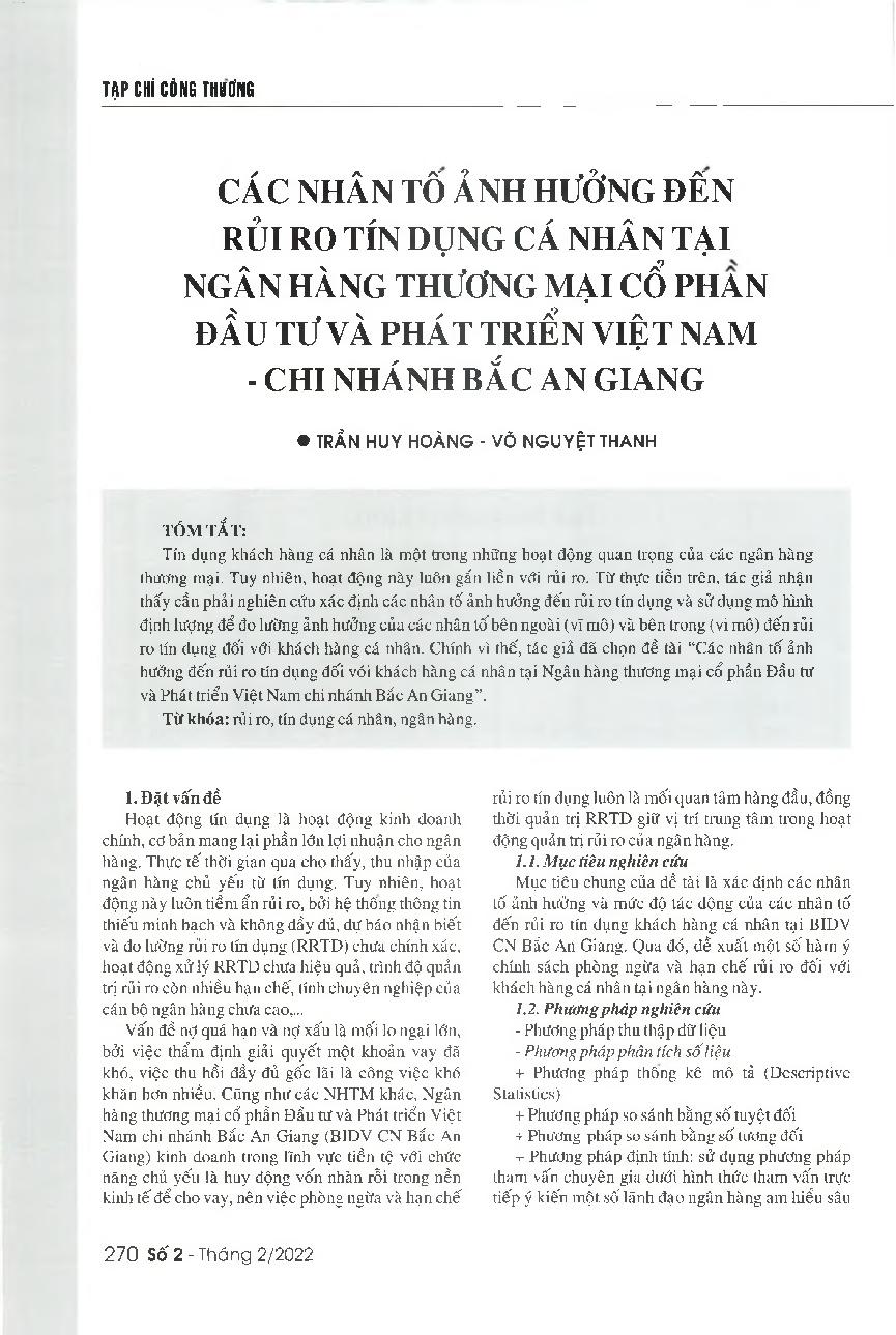 Các nhân tố ảnh hưởng đến rủi ro tín dụng cá nhân tại Ngân hàng TMCP Đầu tư và Phát triển Việt Nam - Chi nhánh Bắc An Giang = Factors affecting the credit risk of individual customers at the Joint stock Commercial Bank for Investment and Development of Vi