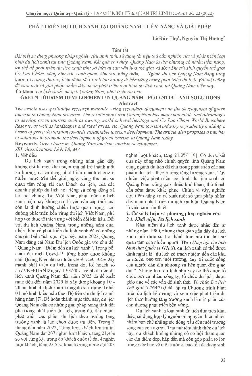 Phát triển du lịch xanh tại Quảng Nam - Tiềm năng và giải pháp = Green tourism development in Quang Nam - potential and solutions