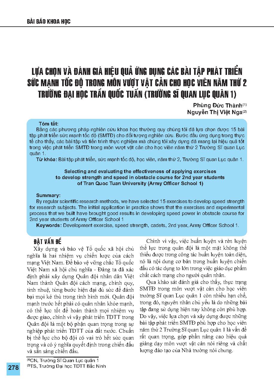 Lựa chọn và đánh giá hiệu quả ứng dụng các bài tập phát triển sức mạnh tốc độ trong môn vượt vật cản cho học viên năm thứ 2 Trường Đại học Trần Quốc Tuấn (Trường Sĩ quan Lục quân 1) = Selecting and evaluating the effectiveness of applying exercises to dev