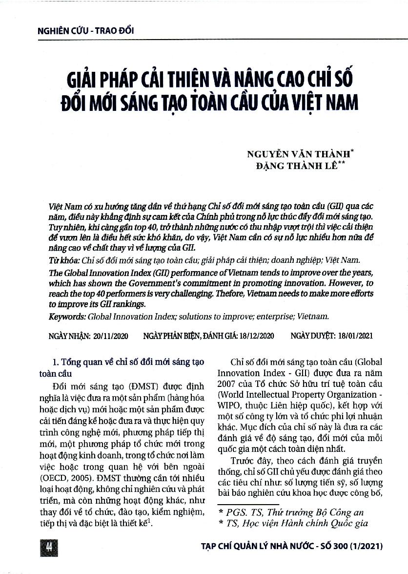 Giải pháp cải thiện và nâng cao chỉ số đổi mới sáng tạo toàn cầu của Việt Nam = Solutions to improve and enhance Vietnam's global innovation index