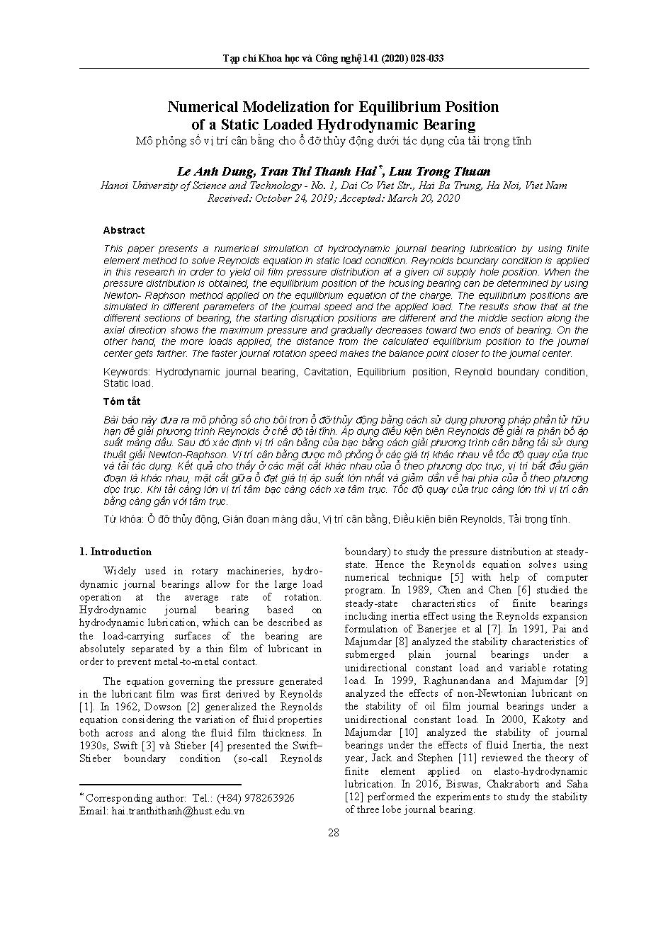 Mô phỏng số vị trí cân bằng cho ổ đỡ thủy động dưới tác dụng của tải trọng tĩnh = Numerical Modelization for Equilibrium Position of a Static Loaded Hydrodynamic Bearing