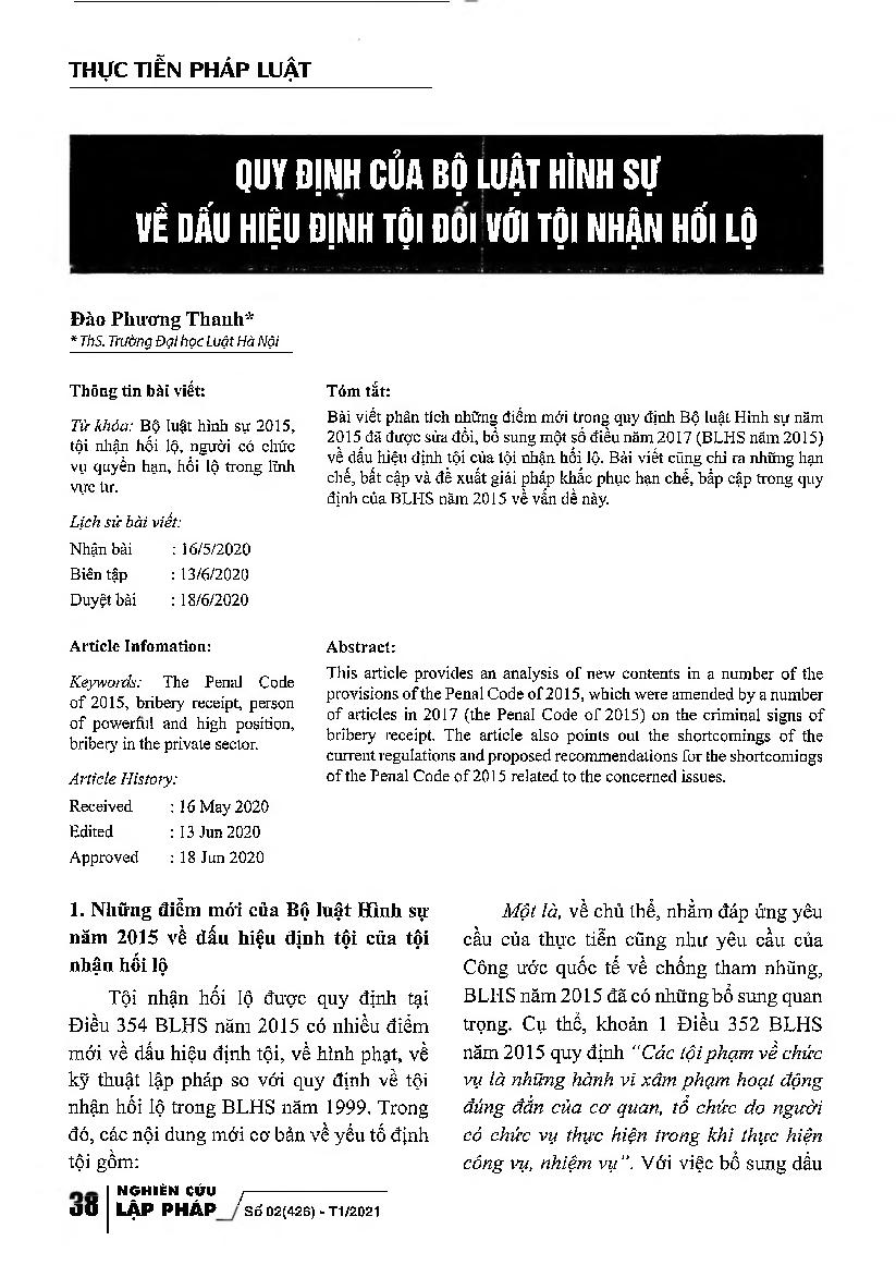 Quy định của Bộ luật Hình sự về dấu hiệu định tội đối với tội nhận hối lộ