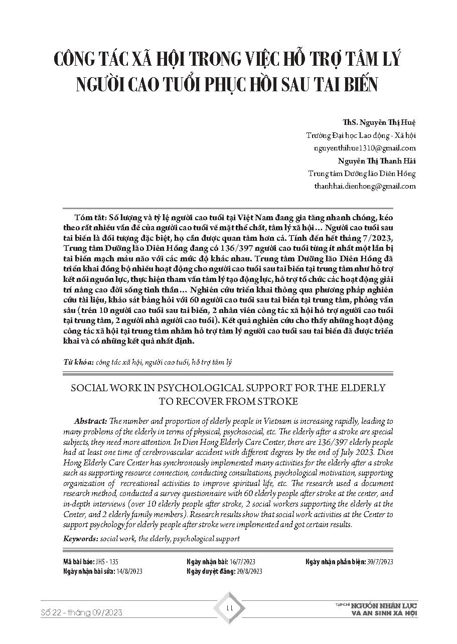Công tác xã hội trong việc hỗ trợ tâm lý người cao tuổi phục hồi sau tai biến = Social work in psychological support for the elderly to recover from stroke