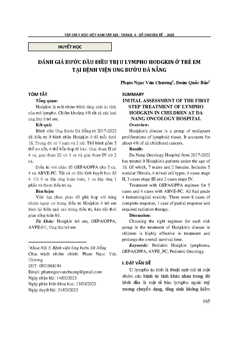 Đánh giá bước đầu điều trị u lympho hodgkin ở trẻ em tại Bệnh viện Ung bướu Đà Nẵng