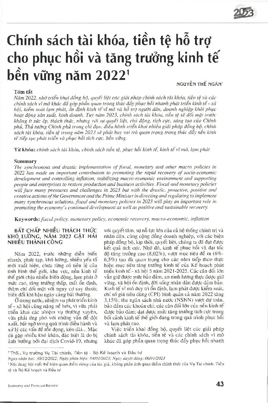 Chính sách tài khóa, tiền tệ hỗ trợ cho phục hồi và tăng trưởng kinh tế bền vững năm 2022 = Fiscal and monetary policies supported economic recovery and sustainable growth in 2022