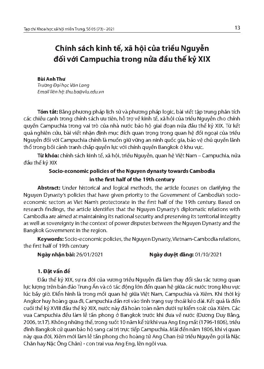 Chính sách kinh tế, xã hội của triều Nguyễn đối với Campuchia trong nửa đầu thế kỷ XIX = Socio-economic policies of the Nguyen dynasty towards Cambodia in the first half of the 19th century