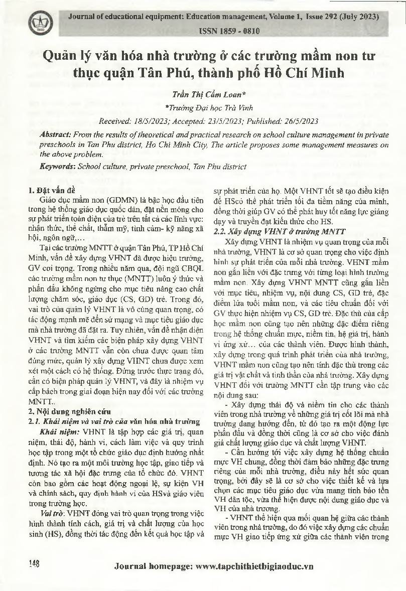 Quản lý văn hóa nhà trường ở các trường mầm non tư thục quận Tân Phú, thành phố Hồ Chí Minh = School culture management in private preschools in Tan Phu district, Ho Chi Minh City.