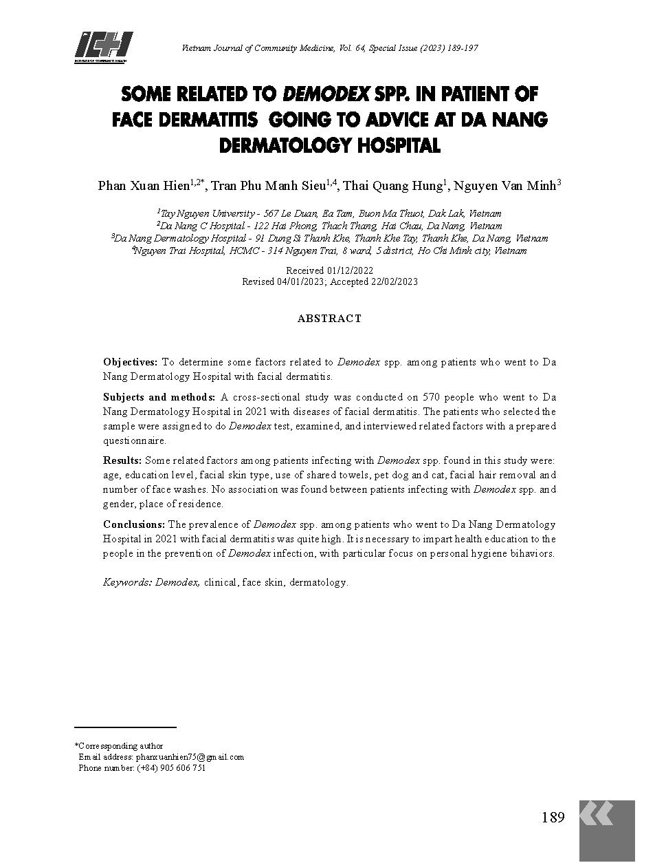 Một số yếu tố liên quan đến tình trạng nhiễm Demodex Spp. ở bệnh nhân viêm da mặt khám tại Bệnh viện Da liễu Đà Nẵng = Some related to Demodex Spp. in patient of face dermatitis going to advice at Da Nang Dermatology Hospita