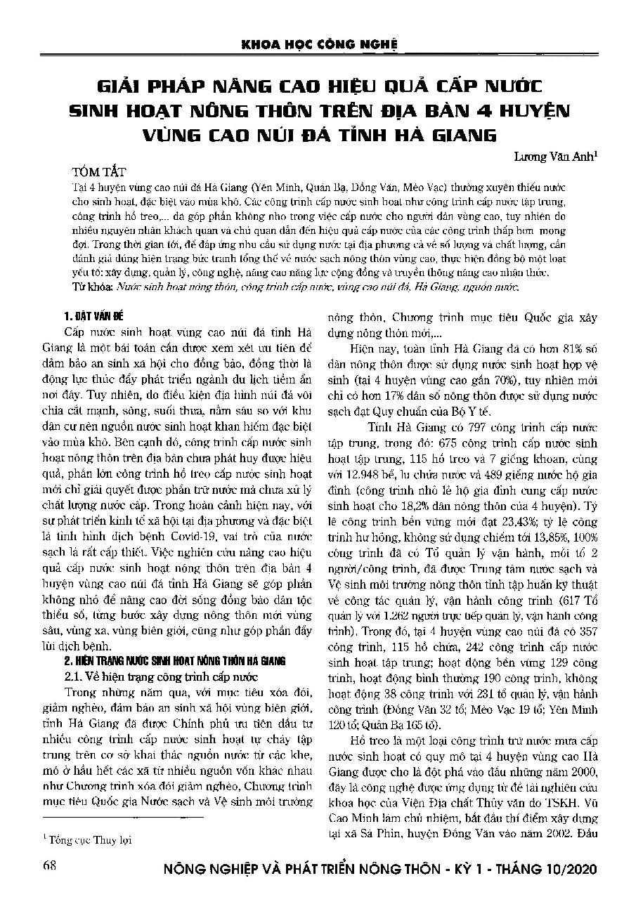 Giải pháp nâng cao hiệu quả cấp nước sinh hoạt nông thôn trên đại bàn 4 huyện vùng cao núi đá tỉnh Hà Giang = Solutions to improve the effciency of rural daily-life water supply in 4 mountainous and Highland districts of Ha Giang province