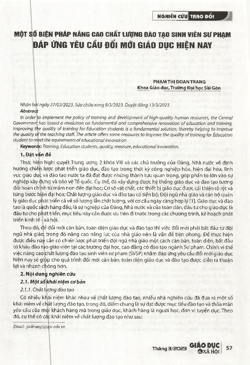 Một số biện pháp nâng cao chất lượng đào tạo sinh viên Sư phạm đáp ứng yêu cầu đổi mới giáo dục hiện nay = Some measures to improve the training quality for Education students to meet the requirements of educational innovation.