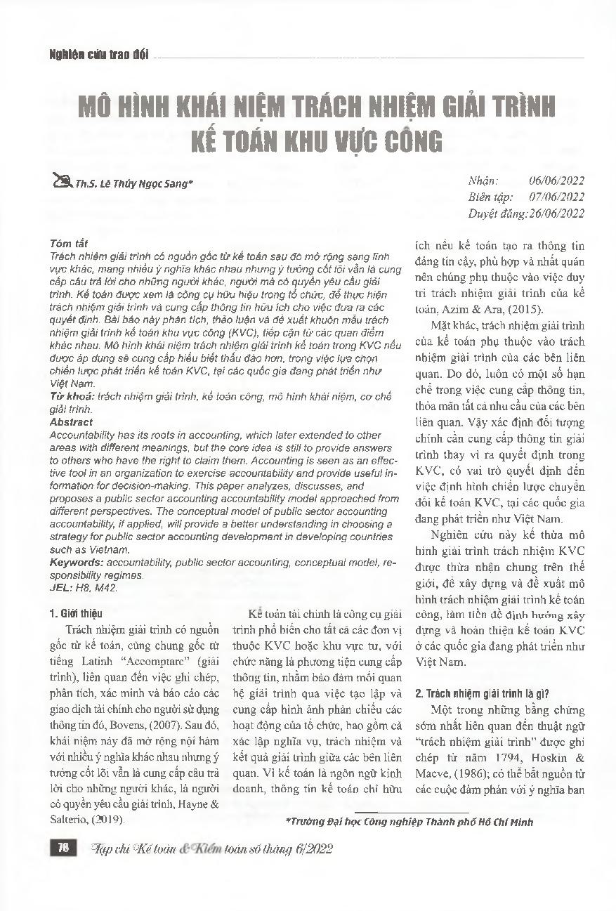 Mô hình khái niệm trách nhiệm giải trình kế toán khu vực công = The accounting responsibility model in the public sector