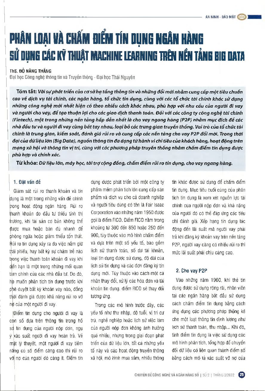 Phân loại và chấm điểm tín dụng ngân hàng sử dụng các kỹ thuật Machine Learning trên nền tảng Big Data = Classification and scoring of bank credit using Machine Learning techniques on Big Data platform